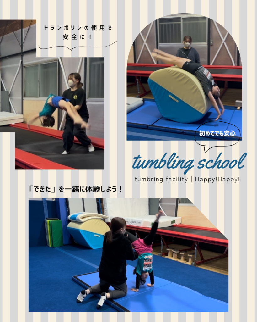 トランポリンや補助具を使用して、側転やブリッジ、バク転、宙返りなどの技の取得を目指します。